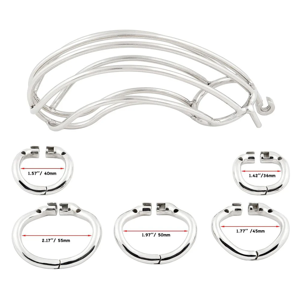 Engineered from body-safe stainless steel, the Steel Big Chastity Cage offers a secure and comfortable fit. Its key feature is a hinged base ring, simplifying the fitting process. You can personalise the fit with a choice of five ring sizes, ranging from 1.42" to 2.17" (36mm–55mm). The main cage provides an internal length of approximately 5 inches with a 1.37" diameter, ensuring a substantial and customisable experience for dedicated wearers seeking a robust and adjustable device.